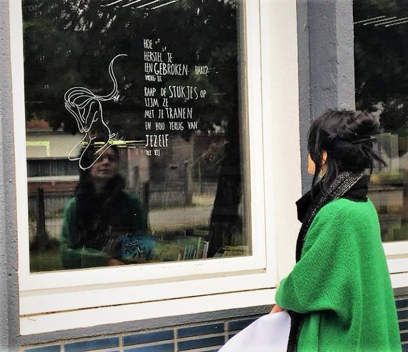 Adelheid vertelt ook nog over haar raampoëzie, wat ze heel dankbaar vindt om te doen. Zo verschenen er een aantal jaren geleden tijdens de Week van de Amateurkunsten bij de handelaars in Laarne overal gedichten op de ramen en ook in Oostende tijdens de 'Drawing Days' mocht Adelheid aan de slag.