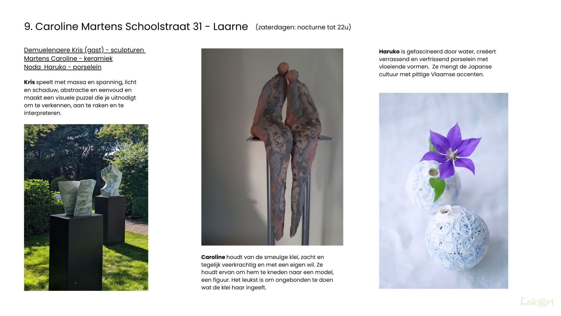 In de tuin van keramiste Caroline Martens word je verwelkomd in een oase van rust en creativiteit. Het is een intieme tuin als openluchtexpo van drie uiteenlopende kunstenaars.. Een plek om te onthaasten en je blik te laten dwalen over vorm, kleur en textuur.