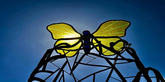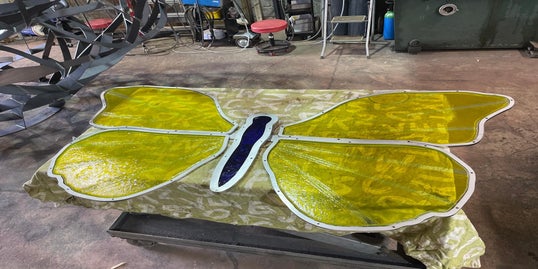 Voor de affiche van de Kunstenroute sloegen twee kunstenaars de handen in elkaar. William Roobrouck, bekend om zijn monumentale sculpturen in cortenstaal, bouwde een expressieve, open structuur — stevig en gelaagd. Bovenaan prijkt een vlinder gecreëerd in glasfusie, van Pejo , subtiel en breekbaar en symbool van hoop, transformatie en vergankelijkheid..