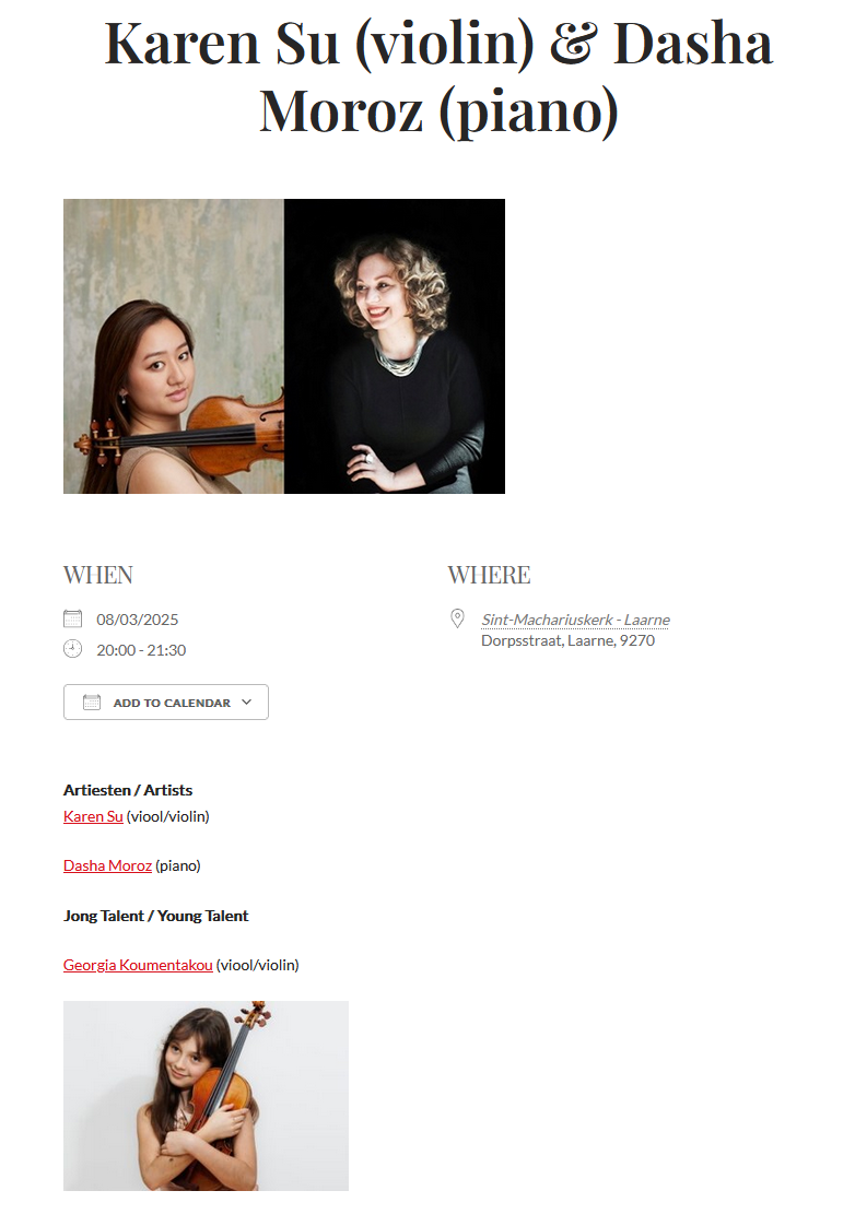 Op zaterdag 08/03/2025 treden jonge muzikale talenten op in de Sint Machariuskerk in Laarne. Traditiegetrouw kan je aansluitend op de receptie in het Oud Gemeentehuis genieten van een glaasje en de kunstwerken van onze leden bewonderen.